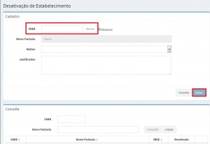 Na próxima tela (Figura 6), o usuário deverá preencher o código do CNES que deseja desativar, clicar em "Buscar" para que o nome fantasia seja carregado. Em seguida, selecionar o motivo de desativação, e, caso necessário, emitir a justificativa complementar na área específica pata tal. Para prosseguir com a desativação, o usuário deve clicar em "Salvar". O usuário poderá consultar o estabelecimento desativado na área Consulta através da digitação de CNES e Nome Fantasia.